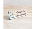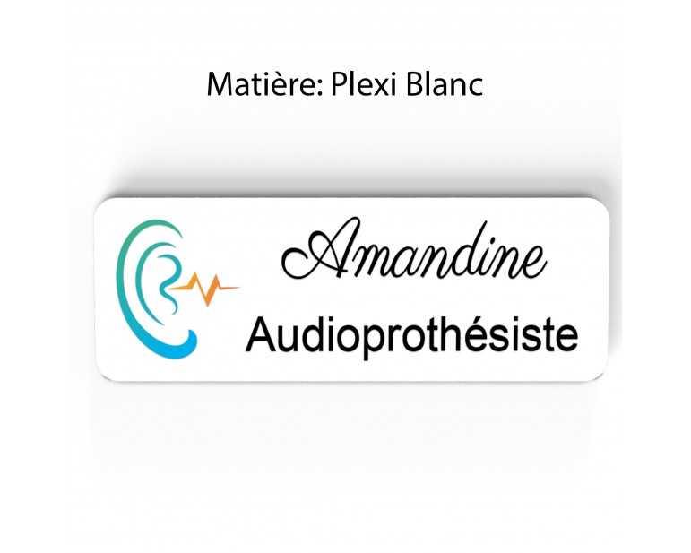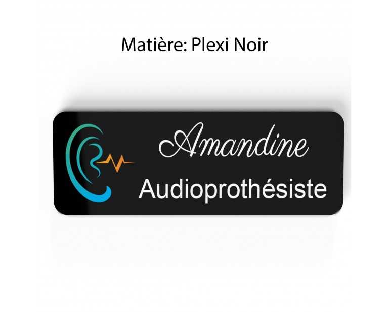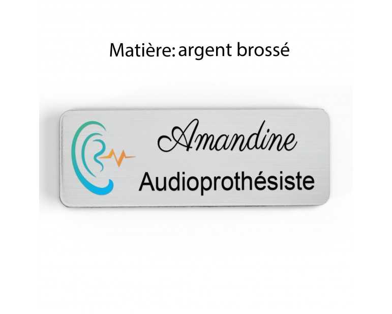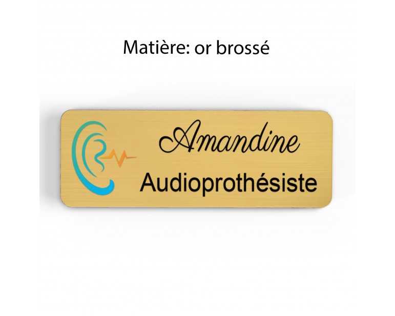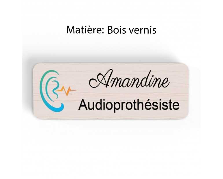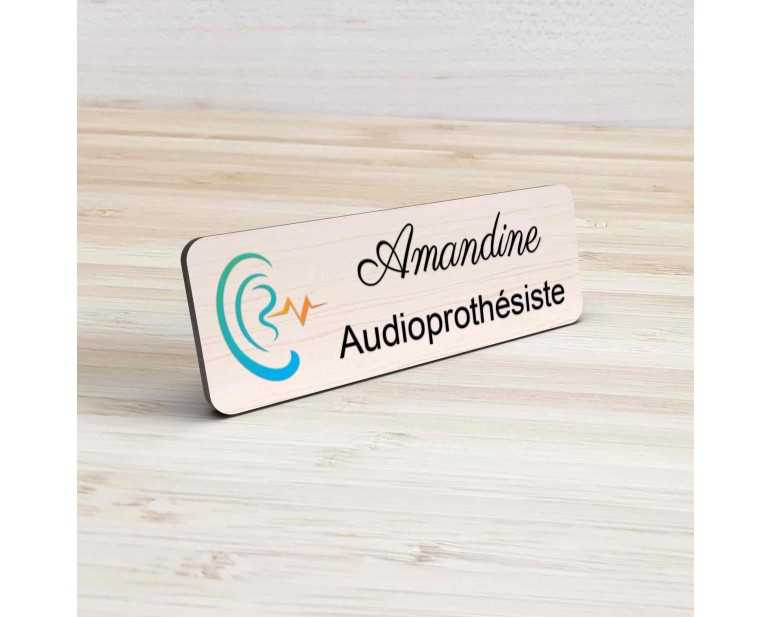 Badge couleur Audioprothésiste Personnalisable, Audiologiste, Orthophoniste, Audioprothésiste en bois, or brossé, argent brossé ou acrylique noir et blanc au choix Audiologiste.