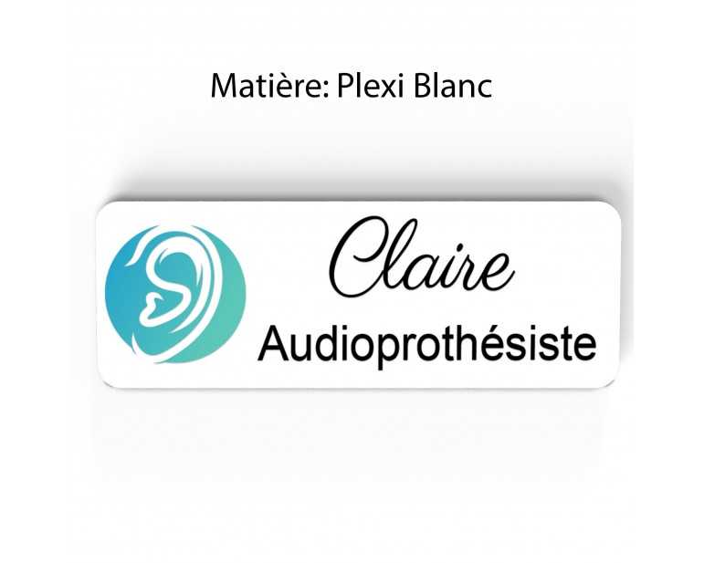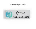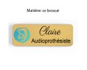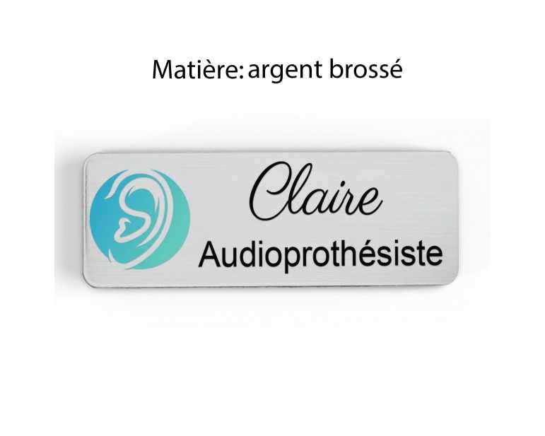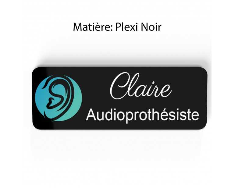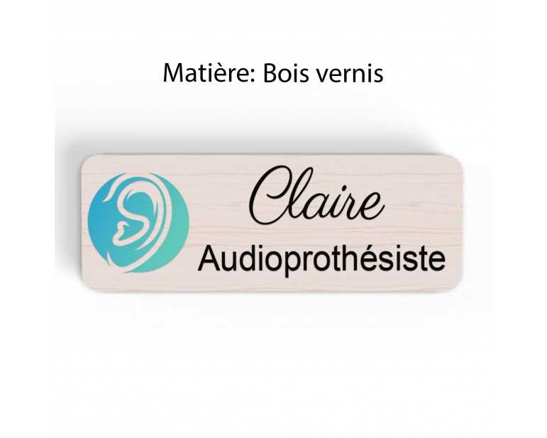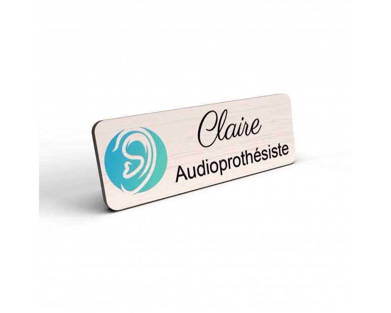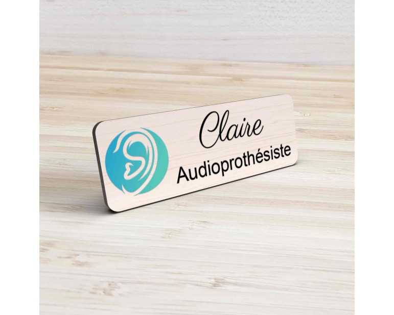 Badge couleur Audioprothésiste Personnalisable, Audiologiste, Orthophoniste, Audioprothésiste en bois, or brossé, argent brossé ou acrylique noir et blanc au choix Audiologiste.