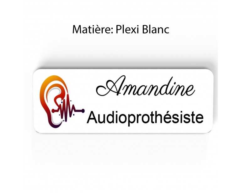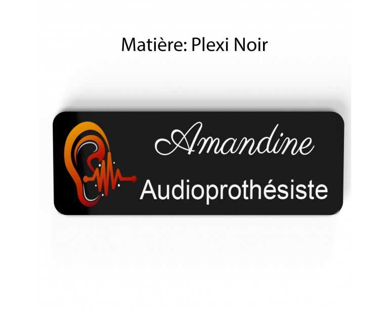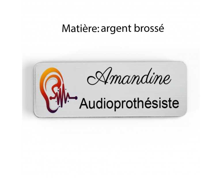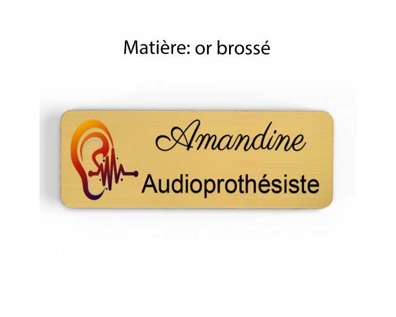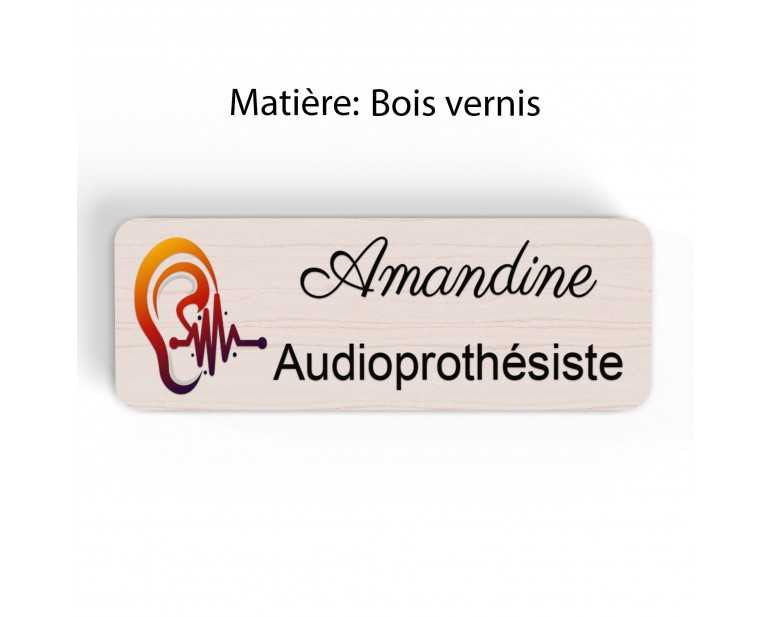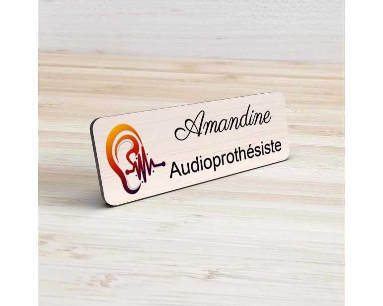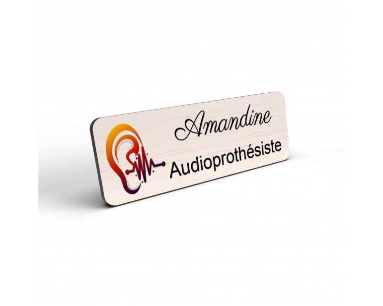 Badge couleur Audioprothésiste Personnalisable, Audiologiste, Orthophoniste, Audioprothésiste en bois, or brossé, argent brossé ou acrylique noir et blanc au choix Audiologiste.