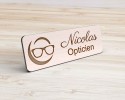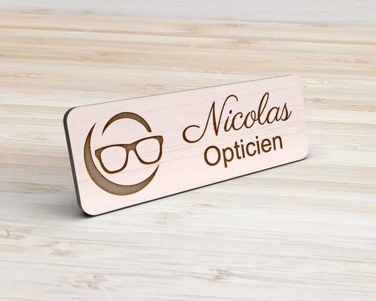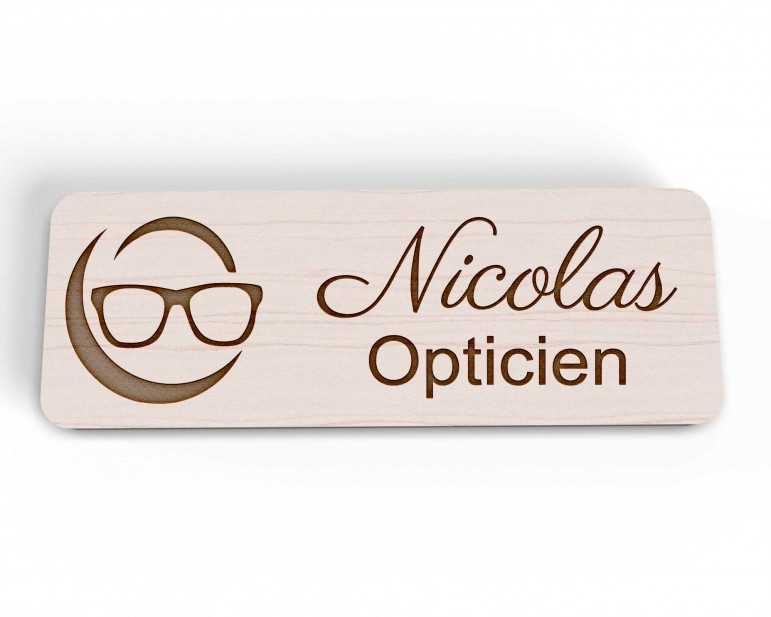 Badge opticien en bois personnalisé, Opticien, Optométriste, Ophtalmologiste, Orthoptiste, Lunetier, Technicien en optique, Chercheur en optique, Ingénieur optique, Vendeur en optique, monteur-vendeur.