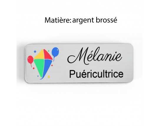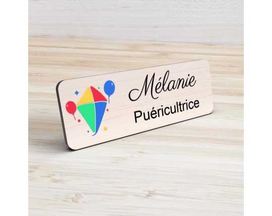 Badge puéricultrice Personnalisable spécialistes bien être, conseillère beauté, sophrologue bois, or brossé, argent brossé acrylique blanc et noir au choix.
