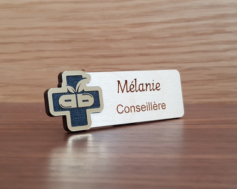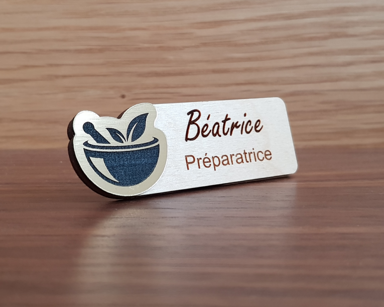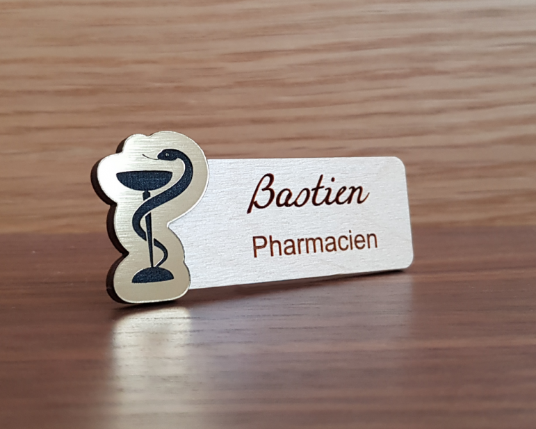 Badge pharmacie personnalisé bois et or brossé acrylique