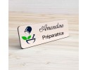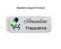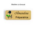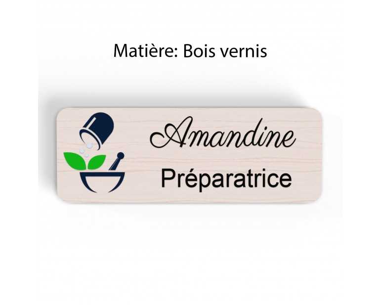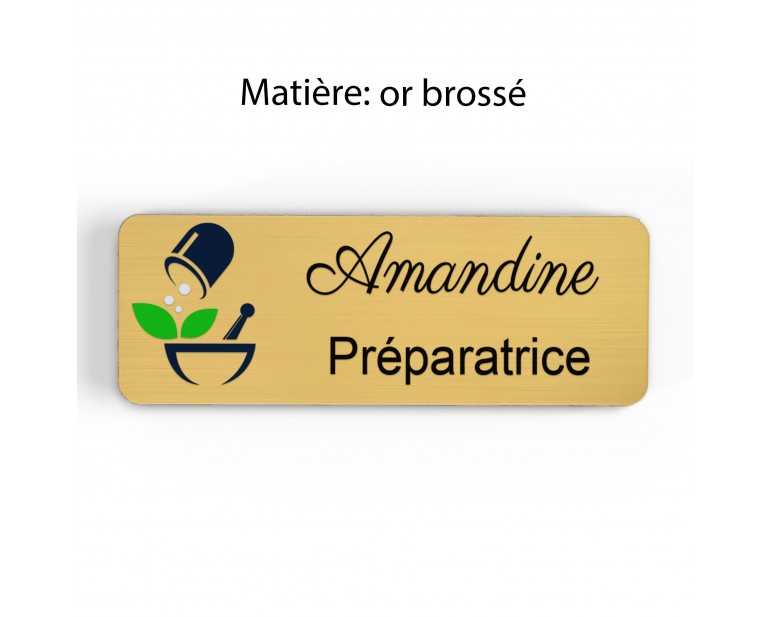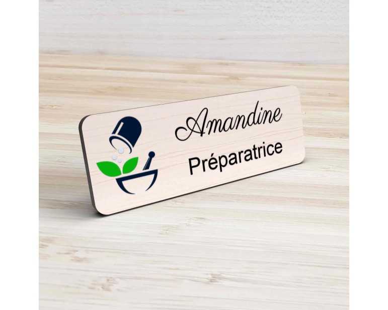 Badge pharmacie Personnalisé Préparateurs, Préparatrice bois, or brossé, argent brossé acrylique blanc et noir