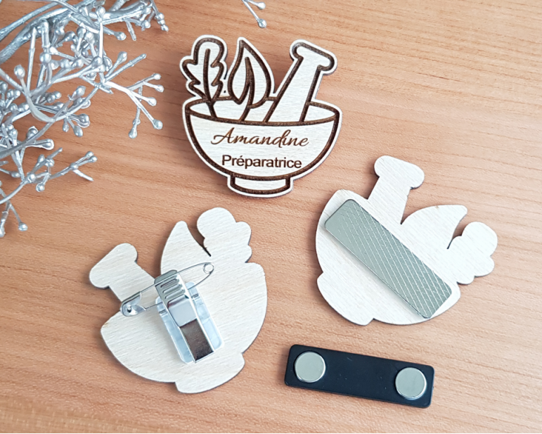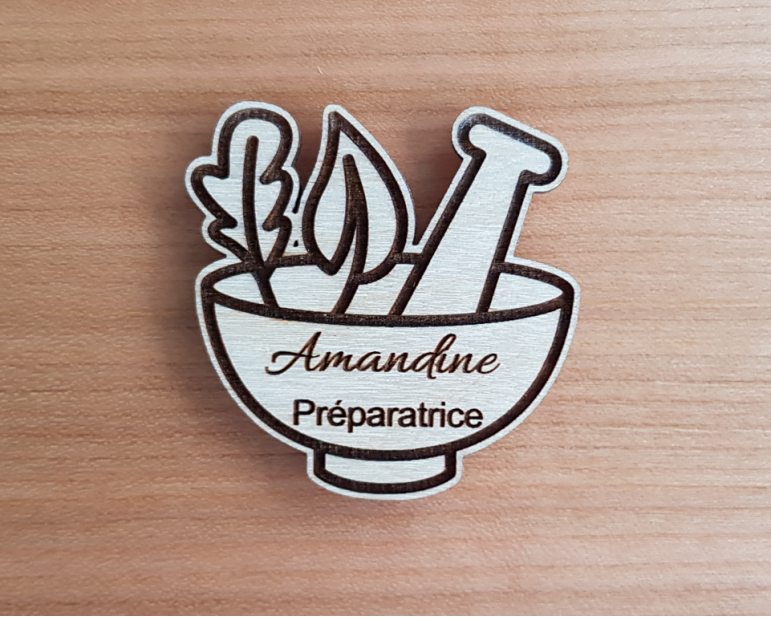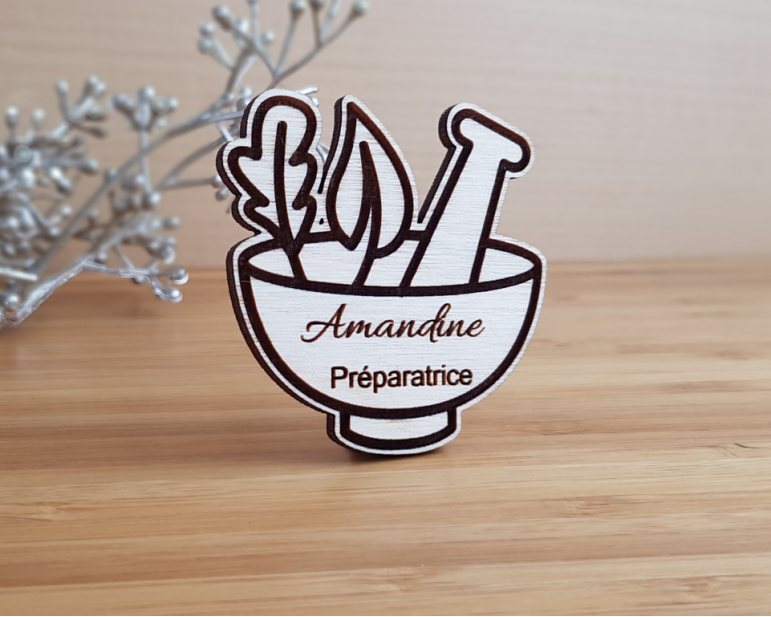 Badge en bois pharmacie mortier personnalisé préparatrice élève préparateur