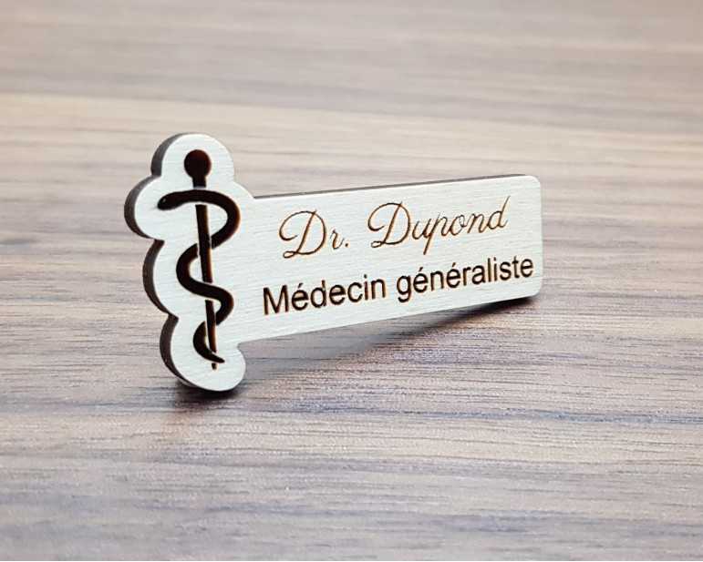 Badges médicaux caducée différents modèles personnalisés en bois, médecin, interne en médecine, cardiologue, infirmière, docteur, médecin généraliste, soignant.