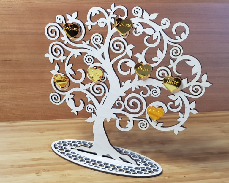 Cet arbre de vie se compose de 2 parties, l'arbre en bois découpé et les prénoms de la famille dans des cœurs découpés dans du miroir acrylique rose, or ou argent au laser, Les parties sont collées ensembles.