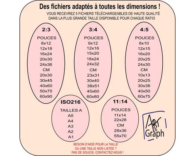 Vous recevrez 5 fichiers JPG haute résolution (300 dpi), dans les tailles maximales de chaque format pour une impression optimale :