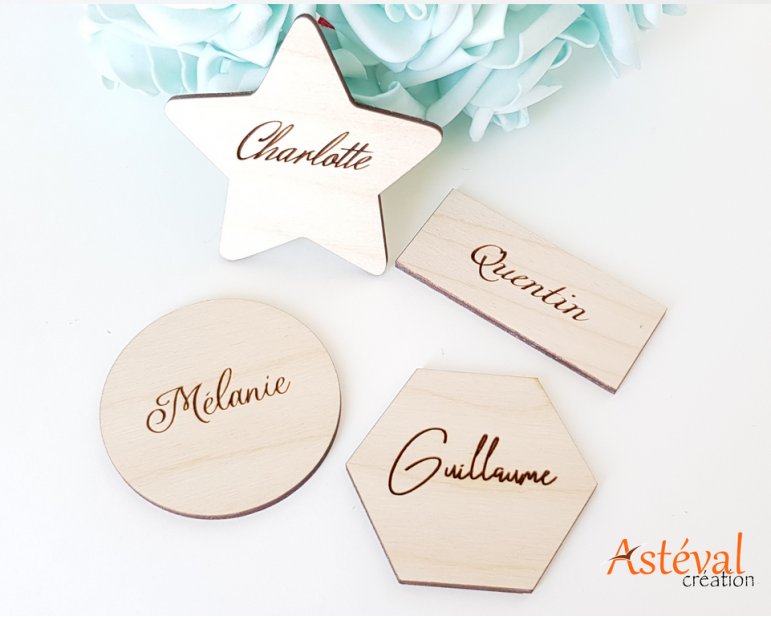 Pour un mariage , personnalisez votre décoration de table avec des marque-places en bois floral, avec leurs prénoms gravés dessus ou autre selon votre imagination.