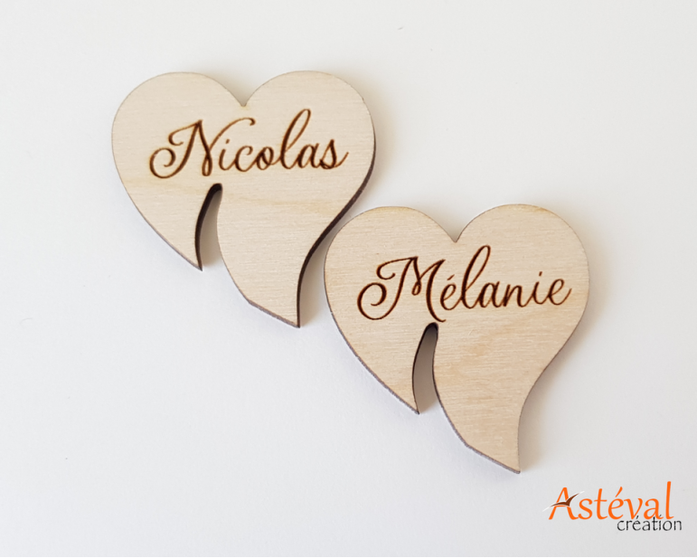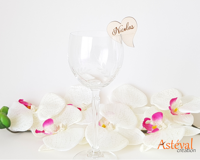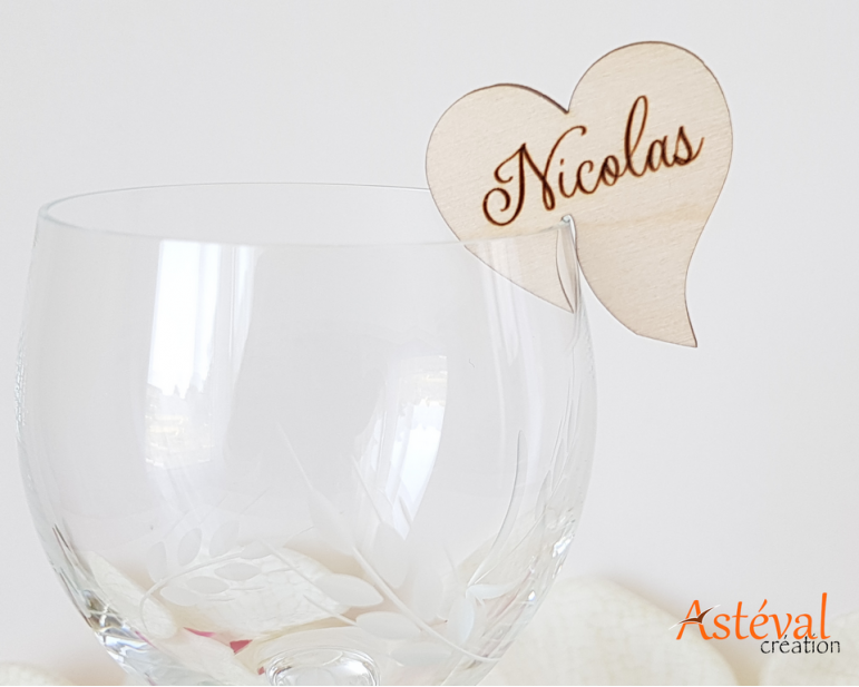 Marque verre, marque place bois personnalisé coeur - Mariage, Baptême, ou Anniversaire - Décoration de table
