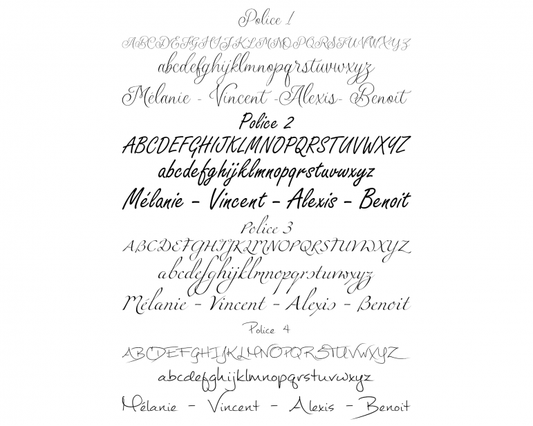 - Précisez la police de caractère que vous désirez, vous avez le choix entre 4 polices (voir photo) si vous ne la précisez pas nous utiliserons la police du modèle photo.