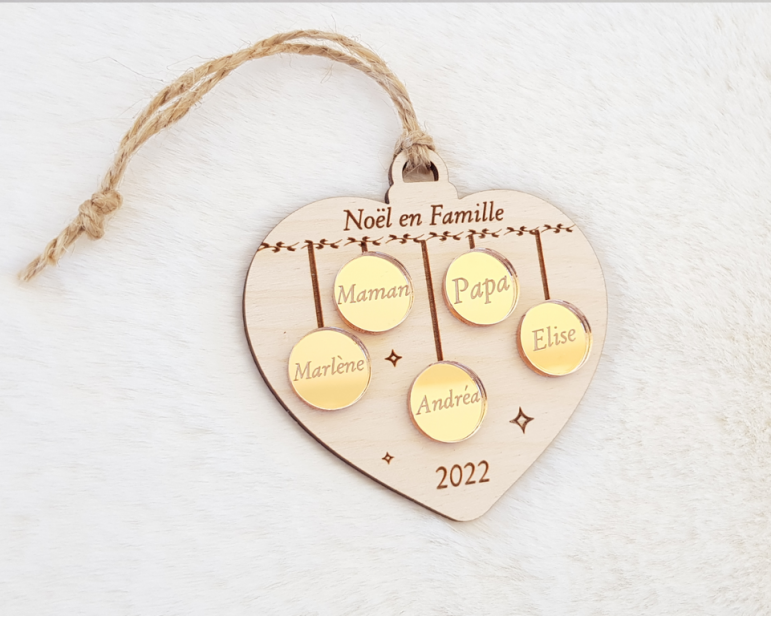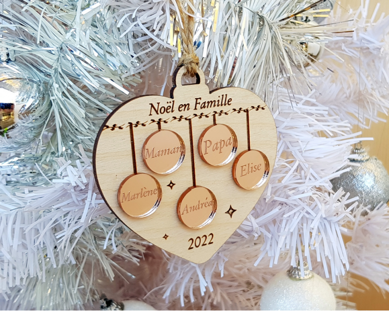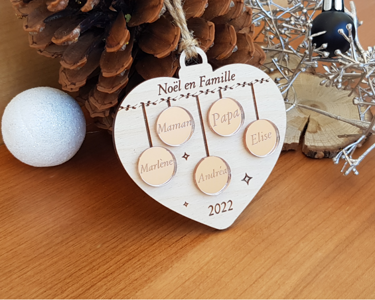 Cette boule de noël cœur se compose de 2 parties, le fond en bois avec les inscriptions gravés, les prénoms de la famille sont découpés dans du miroir acrylique rose, or ou argent au laser, Les parties sont collées ensembles.