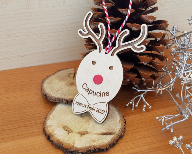 Cette boule de noël se compose de 2 parties, le fond en bois inscription gravés, le nez rouge est découpé de l'acrylique au laser, Les parties sont collées ensembles.