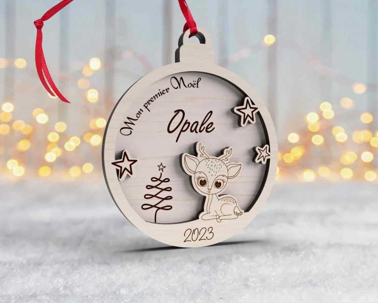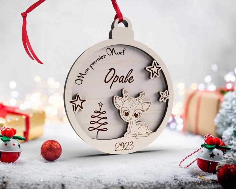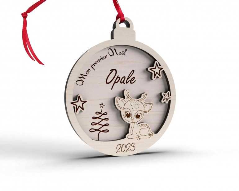 Boule de Noël personnalisée en bois décor cerf enfant mon premier noël
