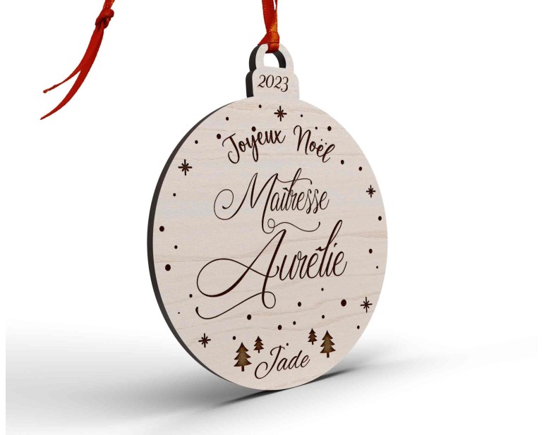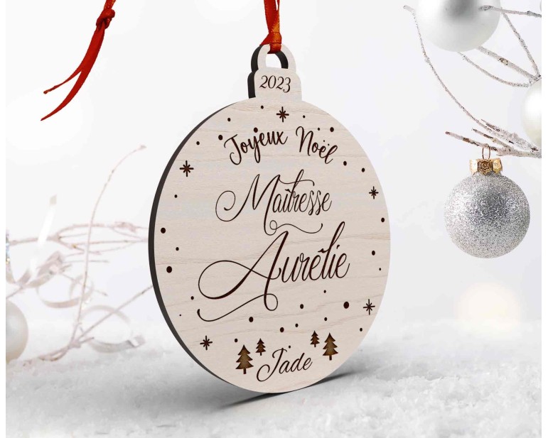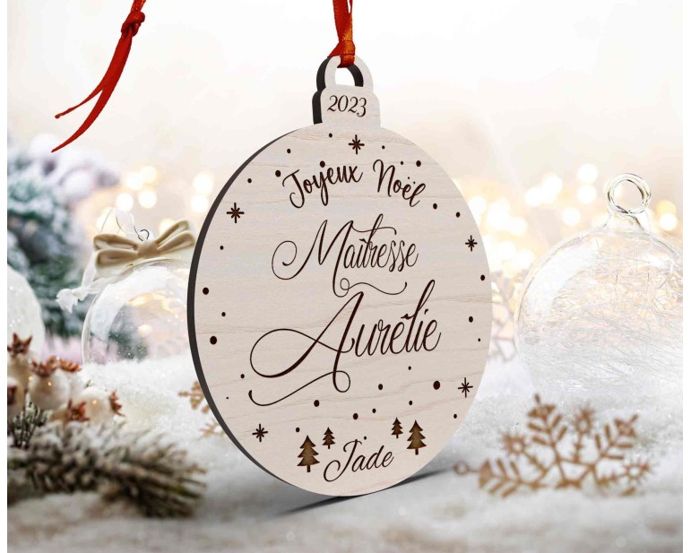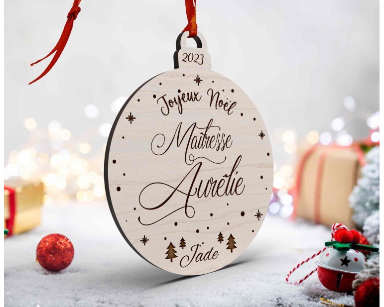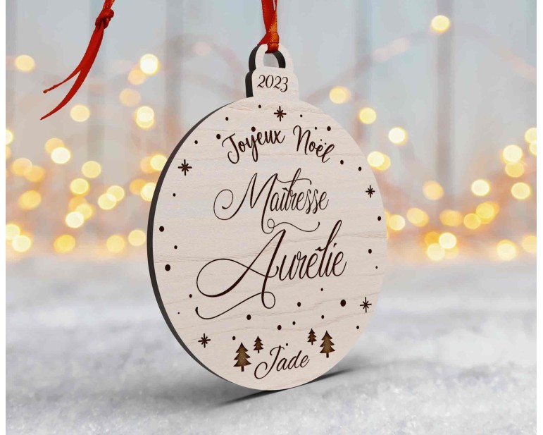 Boule de Noël en bois personnalisée maîtresse, maître, atsem, nounou sapin