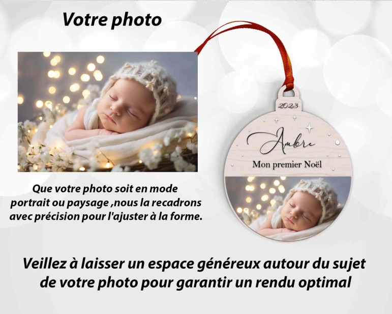 Pour commander, indiquez simplement dans le menu des options le prénom de votre enfant et l’année souhaitée et la phrase "Mon premier Noël" ou autre. télécharger votre photo, Veuillez noter que la photo sera ajustée en demi-cercle.