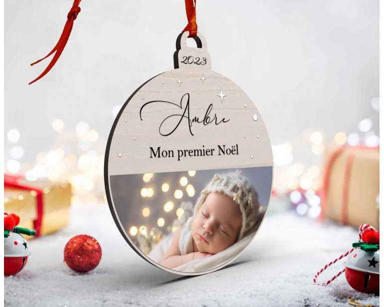 Photo personnalisée Boule de Noël en Bois et couleur Mon Premier Noël