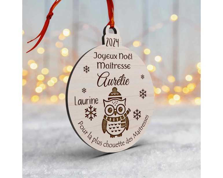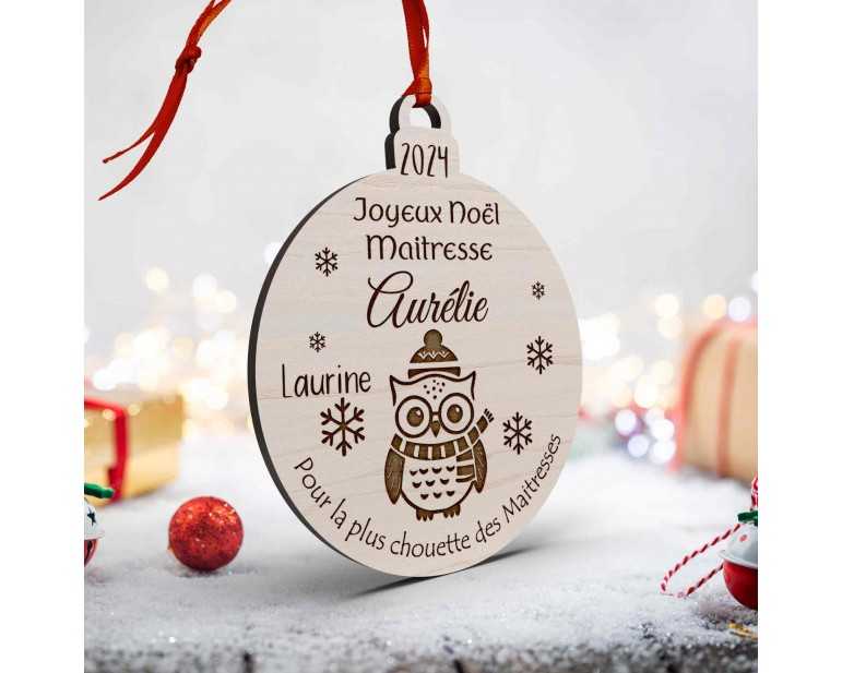 Boule de Noël en bois personnalisée maîtresse, maître, atsem, nounou chouette