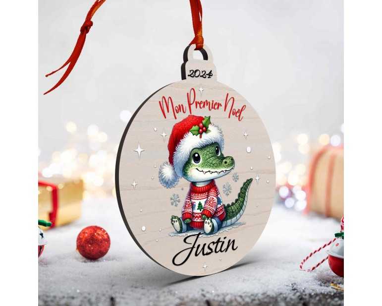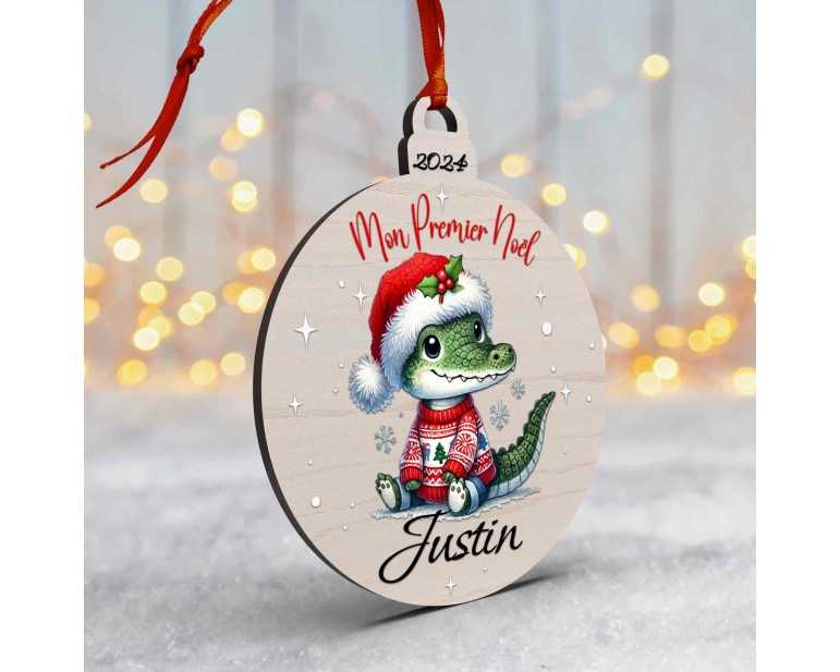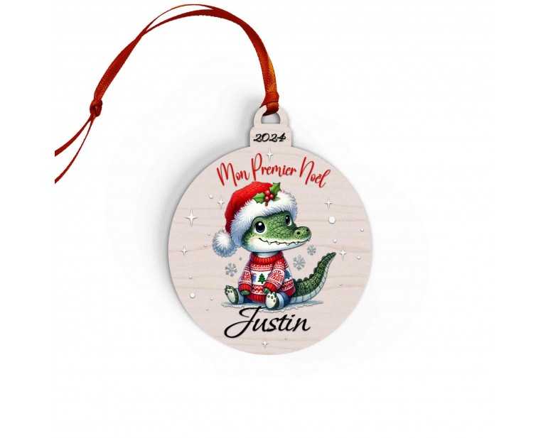 Boule de Noël en Bois Personnalisée avec croco colorée Mon Premier Noël